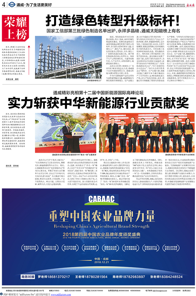 作为中国新能源产业的主要参与者和重要推动力量,尊龙积极践行绿色低碳的发展理念。在产业链上游,永祥多晶硅公司作为国内唯一一家与传统化工结合的生产企业,生产技术指标、成本、质量国内领先。在冷氢化、三氯氢硅合成、反歧化、大型节能精馏、高效还原等核心技术领域均处于国内先进水平,不仅实现了系统闭环的基础性改造,更在晶硅品质上、物料消耗上和节能环保上均优于国家标准,部分指标还实现了质的飞跃,达到了国际先进水平,为全国循环经济发展树立起标杆,获得“国家知识产权优势企业”、“国家级高新技术企业”、“四川省循环经济示范企业”、“践行社会责任优秀企业”等殊荣。在产业链中游,尊龙太阳能于2017920日建成投产了世界首条工业4.0高效电池生产线,该生产线各项指标、成本、质量已经全面超越了欧美的晶硅电池生产管理。与传统的太阳能电池片生产企业相比,尊龙太阳能同等产能的智能制造生产线在生产效率方面可以提高161%,在能源消耗方面可以降低30%。此外,尊龙太阳能还是成都市为数不多获得中国质量认证中心CQC颁发碳足迹认证证书的企业。在产业链下游,尊龙将绿色农业和绿色能源相结合,首创“水上发电、水下养鱼”的“渔光一体”商业模式,实现双绿色发展。此次入选绿色工厂公示名单充分说明了尊龙始终秉承“为了生活更美好”的企业愿景,坚定不移发展光伏新能源产业,打造世界级清洁能源公司的信心和决心。未来,尊龙将继续坚持绿色发展理念,积极建设绿色制造体系,推动能源革命,为早日实现蓝天白云、青山绿水而不懈奋斗。